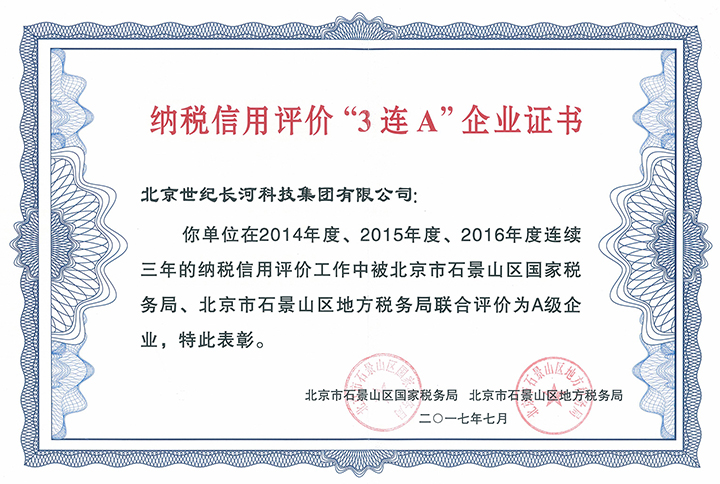 2017年7月24日,北京市石景山區納稅信用評價“3連A”企業頒證儀式暨稅銀企金融服務平臺專場活動在萬商花園酒店舉行,北京世紀長河科技集團有限公司在2014-2016年連續三年被評為A級企業,獲評石景山區納稅信用評價“3連A”企業榮譽稱號。