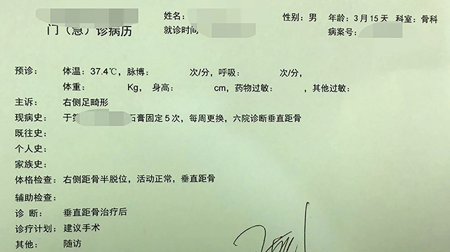 后經(jīng)輾轉(zhuǎn)介紹來到上海尊然醫(yī)院,在趙艷君院長(zhǎng)的安排下,兒童骨科趙黎教授與患兒父母(用英文)交流,對(duì)病情進(jìn)行了客觀而綜合的分析,并對(duì)患兒肢體進(jìn)行查體,后給予治療意見是不需要做手術(shù),僅僅做好觀察即可。當(dāng)孩子父母聽到不需要手術(shù)這個(gè)建議時(shí),非常高興,心里的一塊大石頭終于落地了。